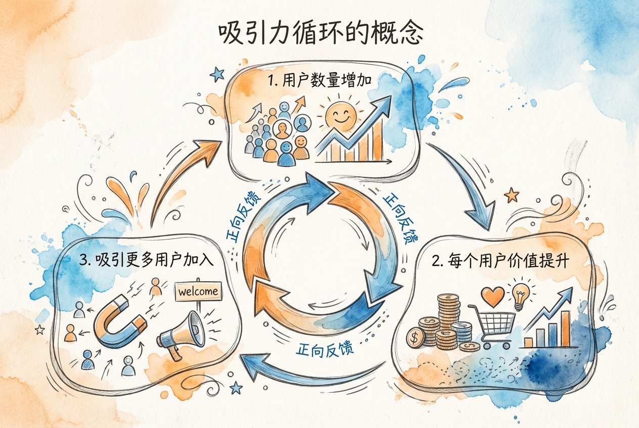 吸引力循环(Attraction Loop)是正向组内网络效应产生的自我强化过程:群体活动水平越高 → 对每个成员增加活动的吸引力越大 → 群体整体活动水平进一步提高。