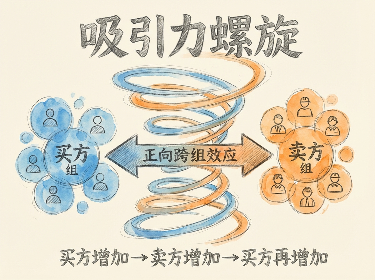 反馈机制:正向组内网络效应产生吸引力循环。双向正向跨组网络效应产生吸引力螺旋。单向正向、单向负向的跨组网络效应产生吸引/排斥钟摆。