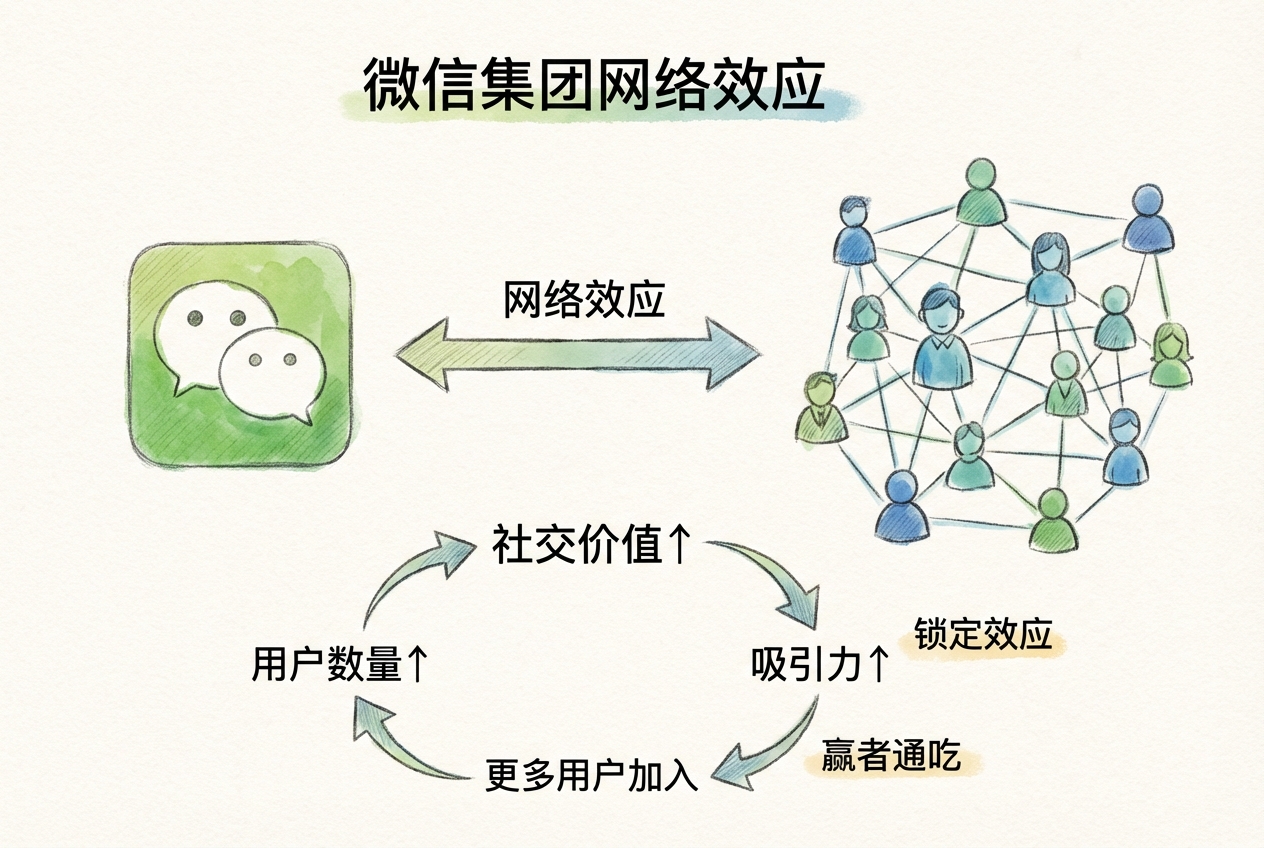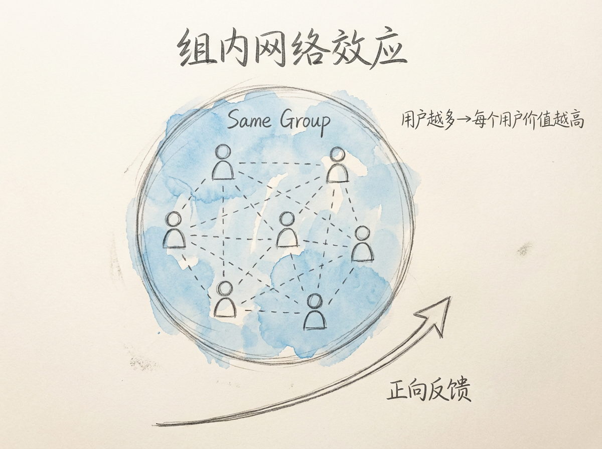 微信的核心价值源于其通讯功能产生的强大组内网络效应。用户加入微信的价值取决于其社交圈中有多少人使用微信——亲友越多,价值越高。这正是典型的吸引力循环: