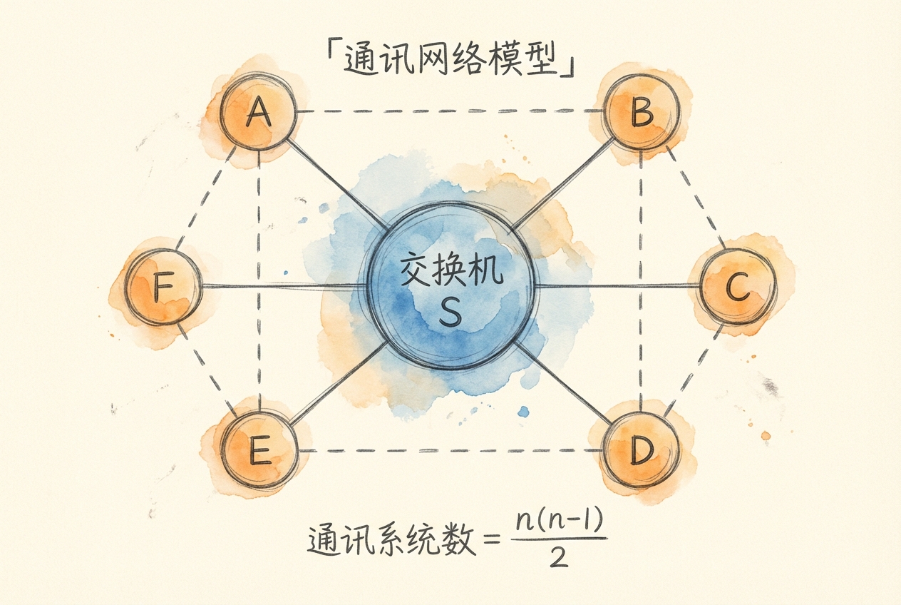 这个星型网络模型假设所有通讯都通过中心交换机进行,简化了现实网络的复杂性。在实际通讯网络中,用户可能通过多种路径连接,网络拓扑可能更复杂(如网状网络)。但星型模型捕捉了网络效应的核心机制:每个新用户创造的价值与现有用户数量成正比。