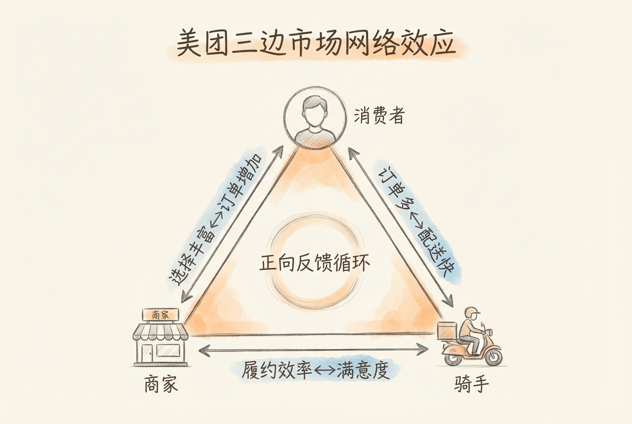 \[ \text{司机越多} \rightarrow \text{乘客等待时间越短} \rightarrow \text{用户体验越好} \rightarrow \text{乘客越多} \rightarrow \text{司机空驶率越低} \rightarrow \text{司机收入越稳定} \rightarrow \text{更多司机加入} \]