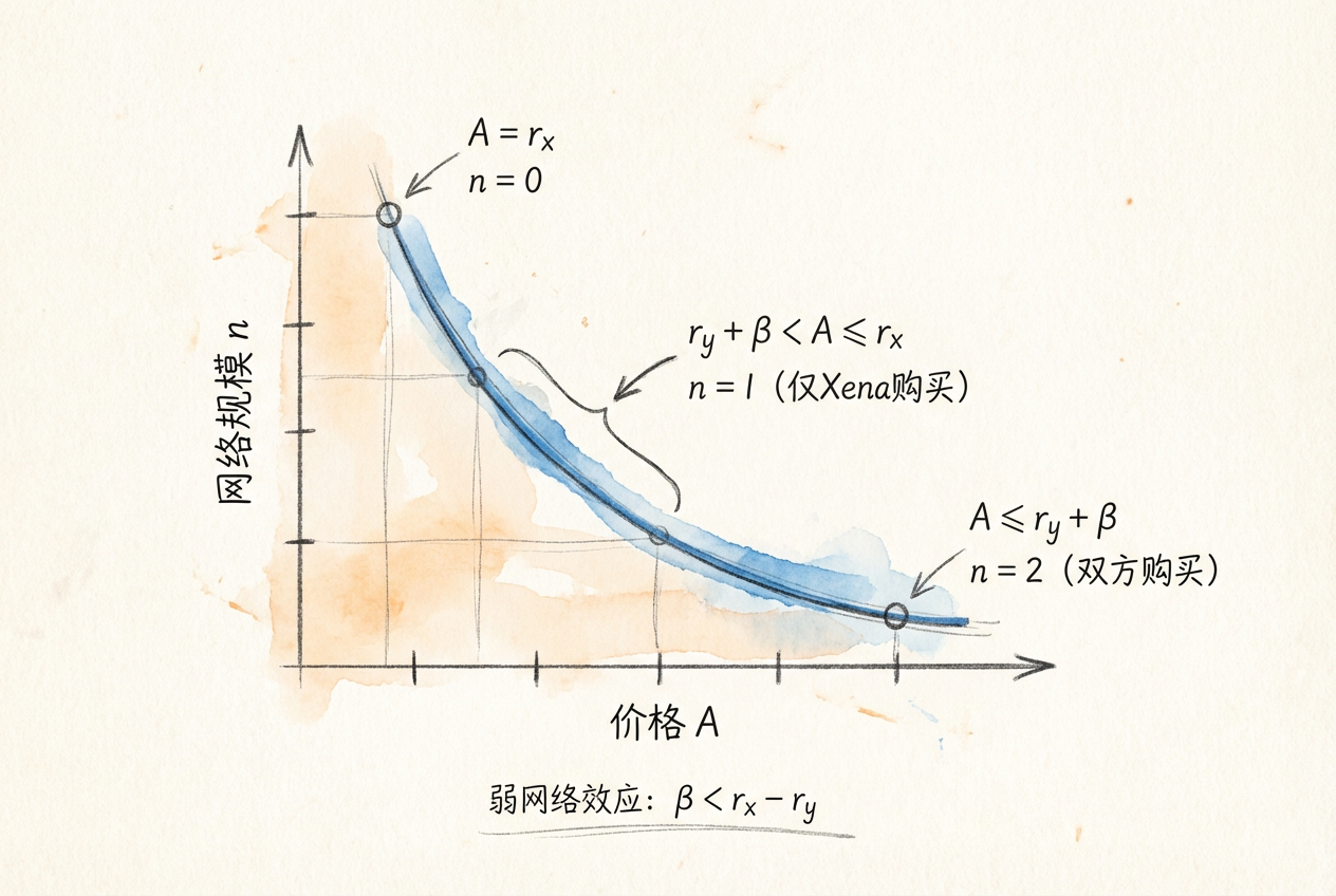 平台选择限制网络规模(只卖给 Xena)的条件是 \(\pi_1 > \pi_2\),即: