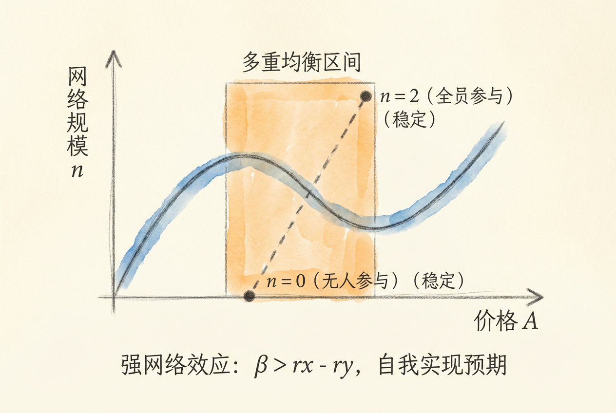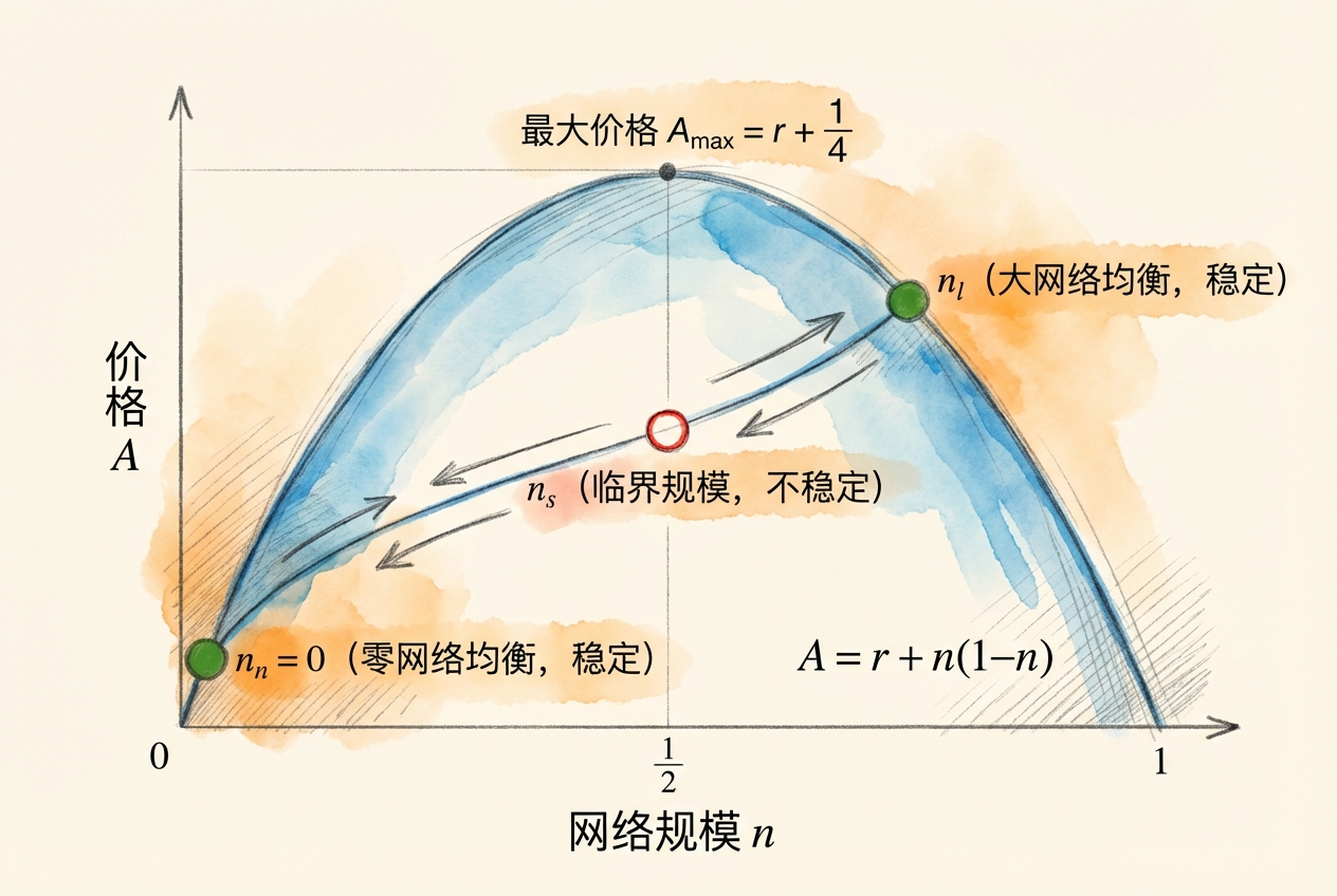 「零网络」和「大网络」均衡是稳定的,而「小网络」均衡是不稳定的。小网络均衡的规模定义了临界规模(Critical Mass)——一旦网络规模超过这个门槛,网络会自动滚雪球式增长,直到达到稳定的大网络均衡。