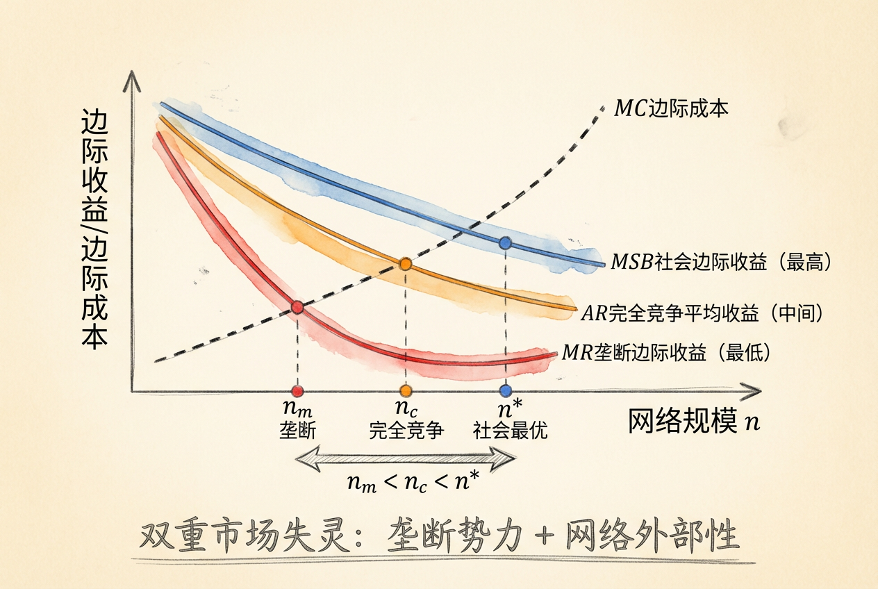 双重市场失灵:垄断势力和网络外部性共同导致网络规模低于社会最优。即使在完全竞争下,用户也不会内化对其他用户的正外部性。