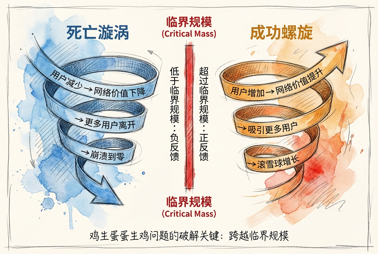 临界规模的存在意味着: 1. 网络建设初期存在「死亡区」——如果无法跨越临界规模,网络必然失败 2. 一旦跨越临界规模,正反馈开始启动 3. 如何度过早期「死亡区」是平台创业的核心挑战