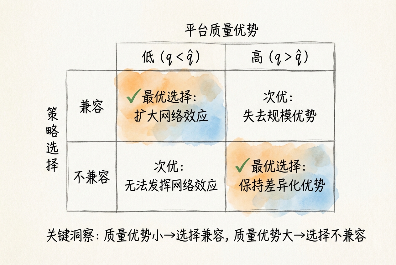 拥有较小质量优势的平台倾向于选择兼容,因为兼容提高了用户支付意愿。拥有较大质量优势的平台倾向于选择不兼容,因为不兼容使其可以利用网络规模优势。然而,平台选择不兼容时可能损害用户利益——用户通常偏好兼容带来的更大网络。