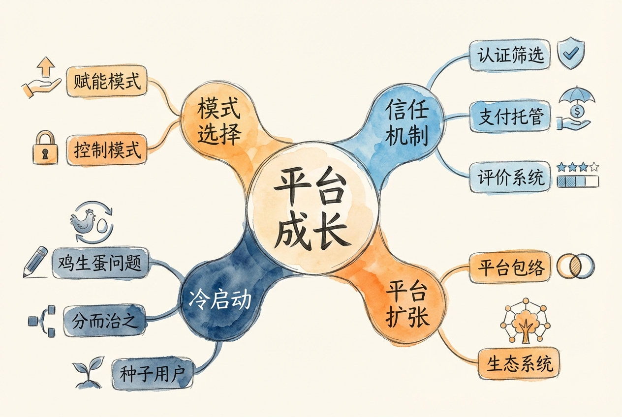 平台的价值创造遵循两步走的逻辑:第一步是把不同群体的用户聚集到一起,第二步是管理用户之间的网络效应。第一步并不简单。没有司机,乘客不会来;没有乘客,司机也不愿加入。这种相互依赖的困境被称为鸡生蛋蛋生鸡问题(Chicken-and-Egg Problem)。本章将系统分析平台如何破解这一难题,以及如何在站稳脚跟后实现进一步扩张。