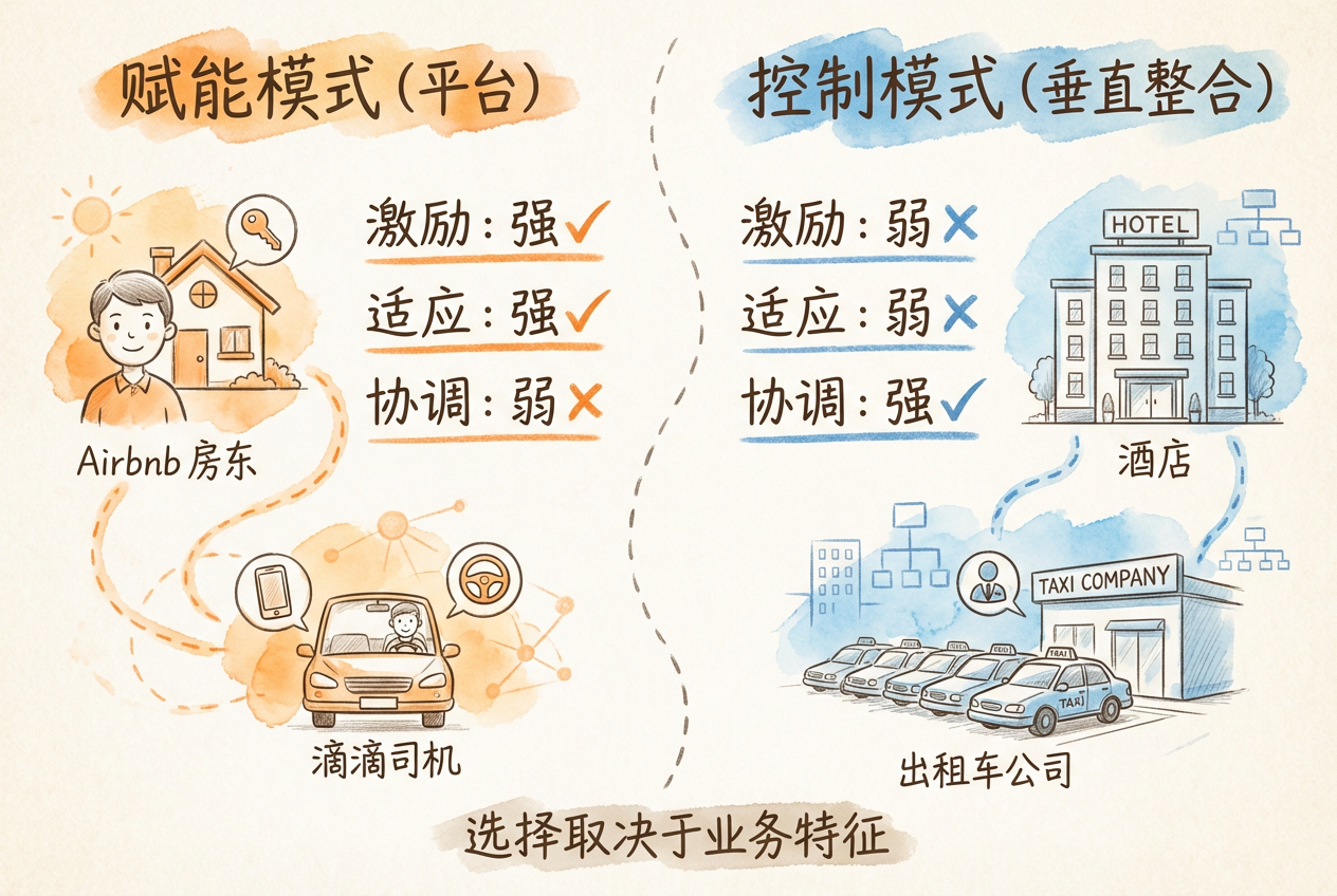 模式选择:平台模式(赋能)在激励和适应方面有优势,垂直整合(控制)在协调方面有优势。选择取决于具体业务特征。