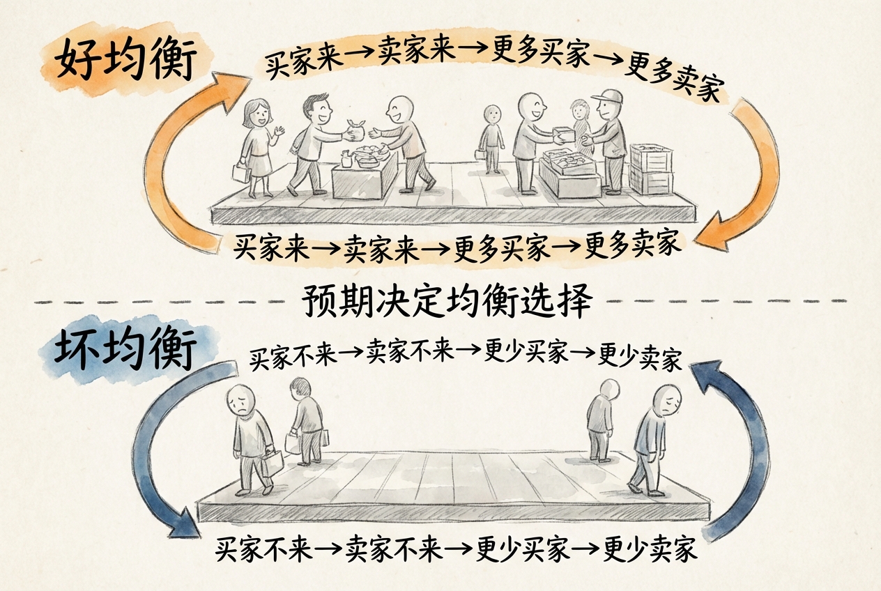 鸡生蛋问题的核心是预期协调失败。两个均衡都是自我实现的预言(self-fulfilling prophecy): - 乐观预期:大家都相信平台会成功 → 都加入 → 平台真的成功 - 悲观预期:大家都相信平台会失败 → 都不加入 → 平台真的失败