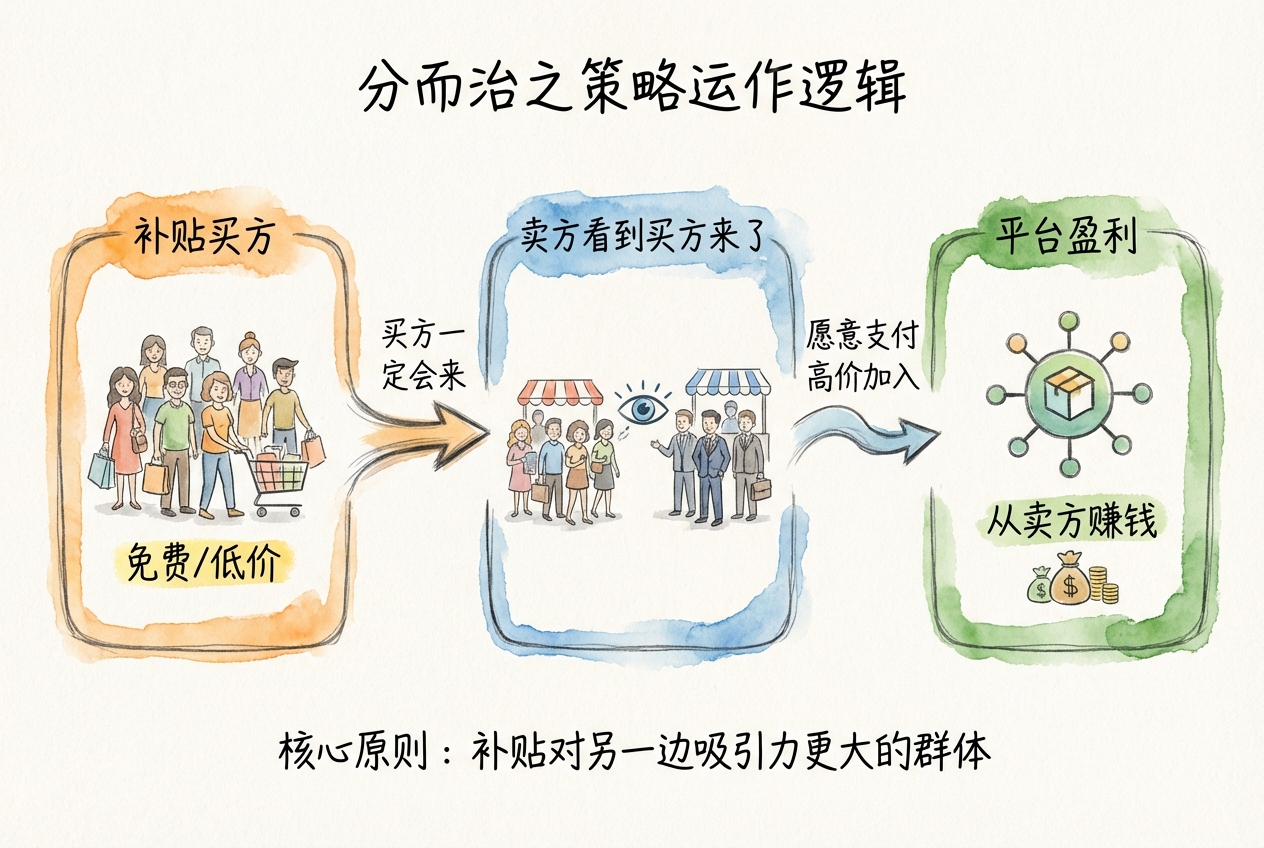 这解释了为什么: - 夜店给女性免费入场,向男性收费(女性对男性吸引力更大) - 购物中心给顾客免费停车,向商户收租金(顾客对商户吸引力更大) - 游戏主机补贴硬件,从游戏开发商赚钱(玩家对开发商吸引力更大)