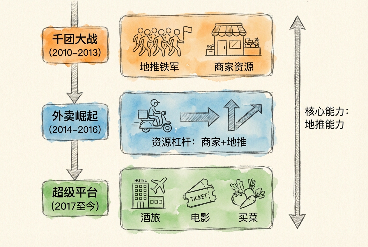 美团扩张的核心资源是地推铁军。2011 年,王兴六顾茅庐从阿里挖来干嘉伟,打造了一支强大的地面推广团队。这支团队帮助美团在千团大战中胜出,积累了大量商家资源和运营经验。