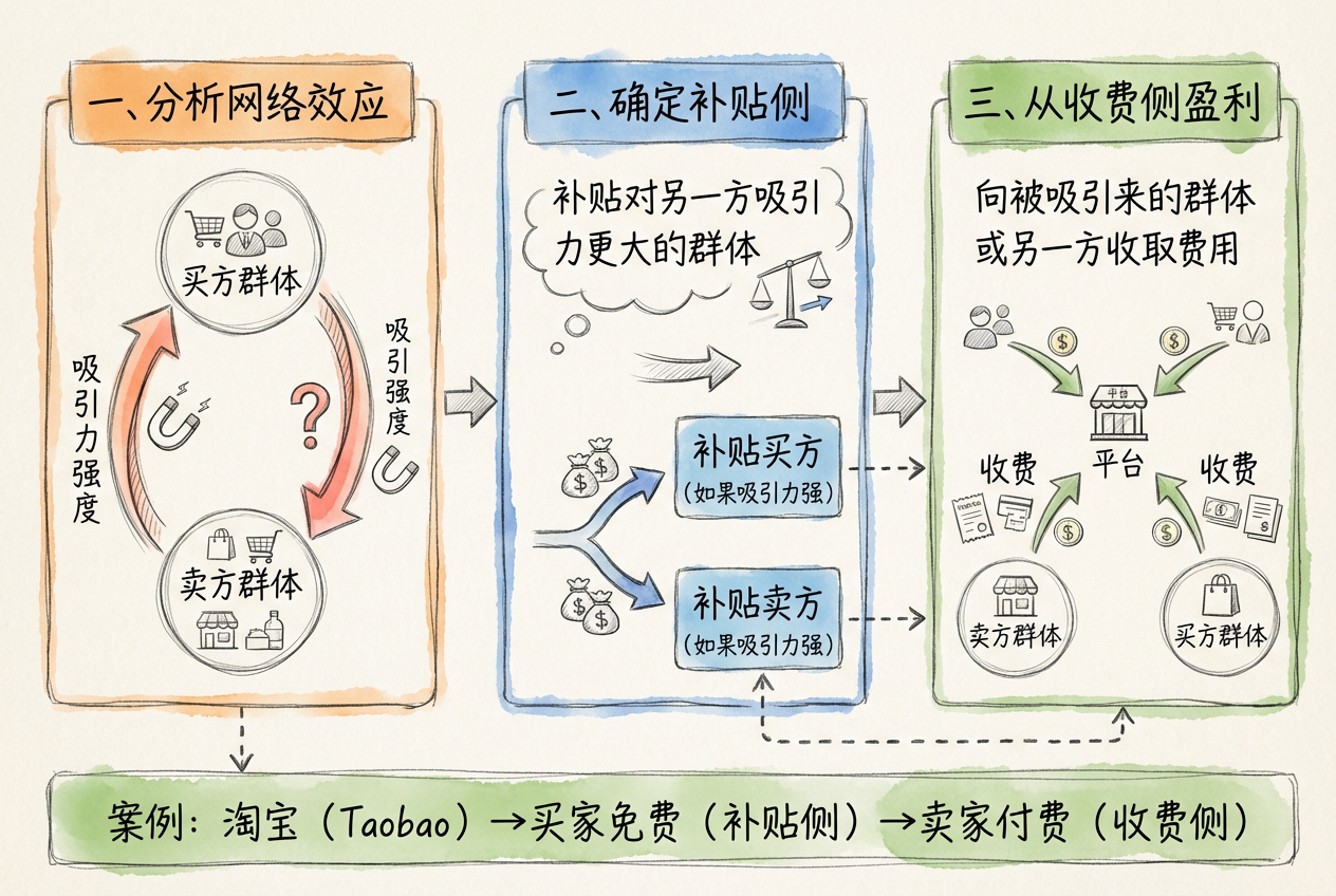 上述定价原则与我们在第 4 章学习的分而治之策略(Divide-and-Conquer)一脉相承:先用低价甚至负价吸引一边用户,再从另一边收费。淘宝对买家免费、向卖家收费的模式,正是这一策略的经典应用。