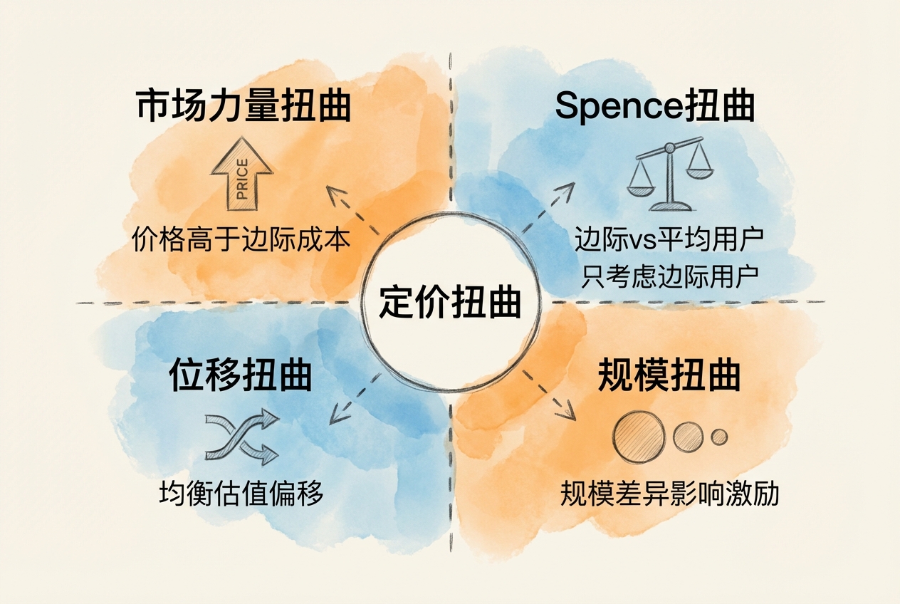 垄断定价存在四类扭曲:市场力量扭曲、Spence 扭曲、位移扭曲、规模扭曲。它们的方向可能相反,导致平台在某一边定价过高、另一边定价过低。