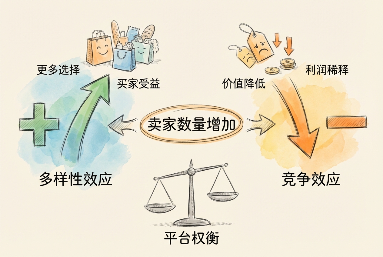 卖家竞争是双刃剑:多样性有利于买家,但过度竞争会稀释每笔交易的价值。平台通过准入控制和流量分配来管理这种权衡。