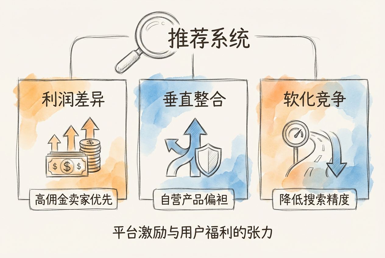 推荐系统有偏是常态:利润差异、垂直整合、软化竞争都可能导致推荐偏离消费者最优。平台的私人激励与社会最优往往不一致。