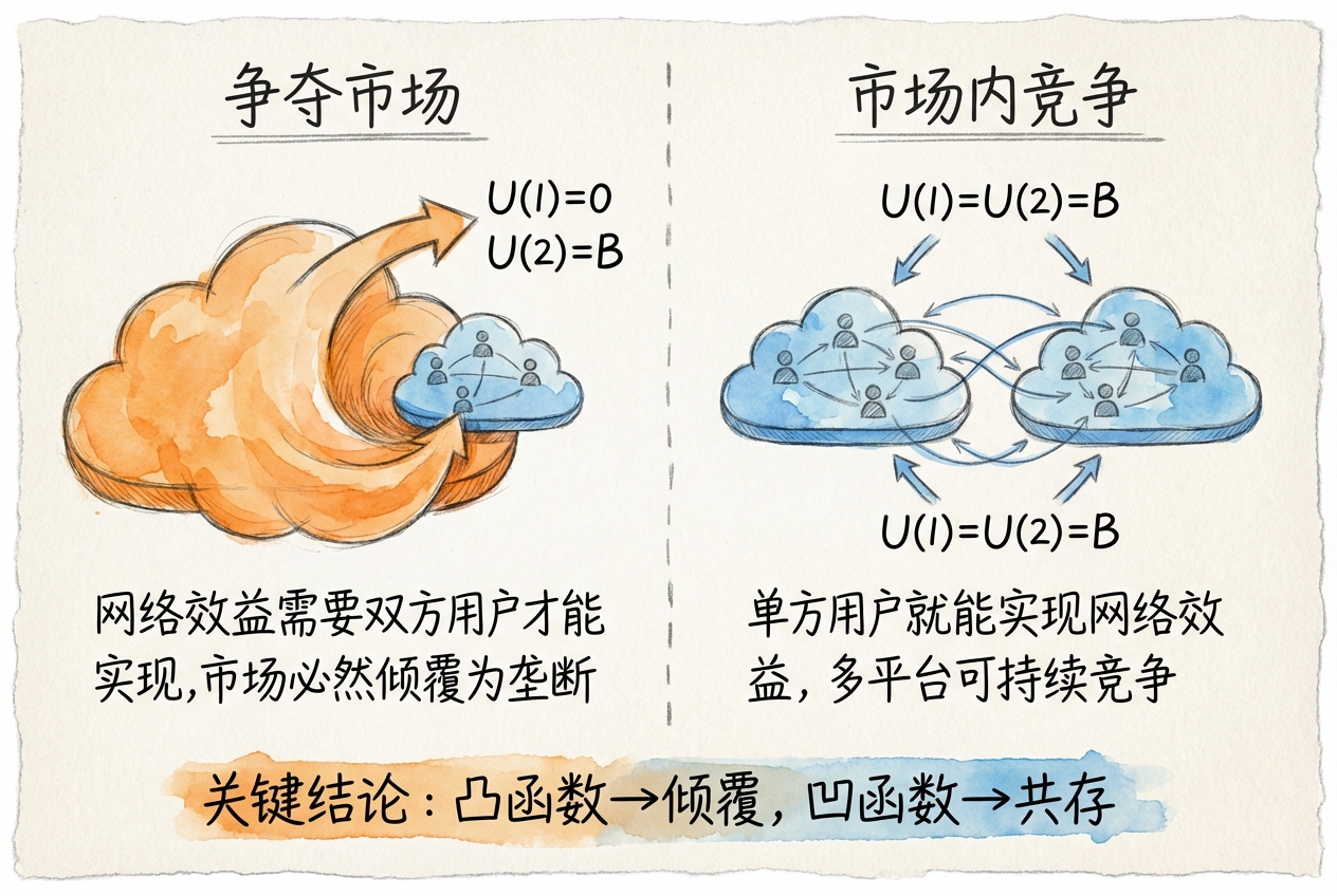 当网络收益函数呈凸性(\(U(1)\) 远小于 \(U(2)\)),市场趋向倾覆,形成「争夺市场」格局;当网络收益函数呈凹性(\(U(1)\) 接近 \(U(2)\)),市场可容纳多平台,形成「市场内竞争」格局。