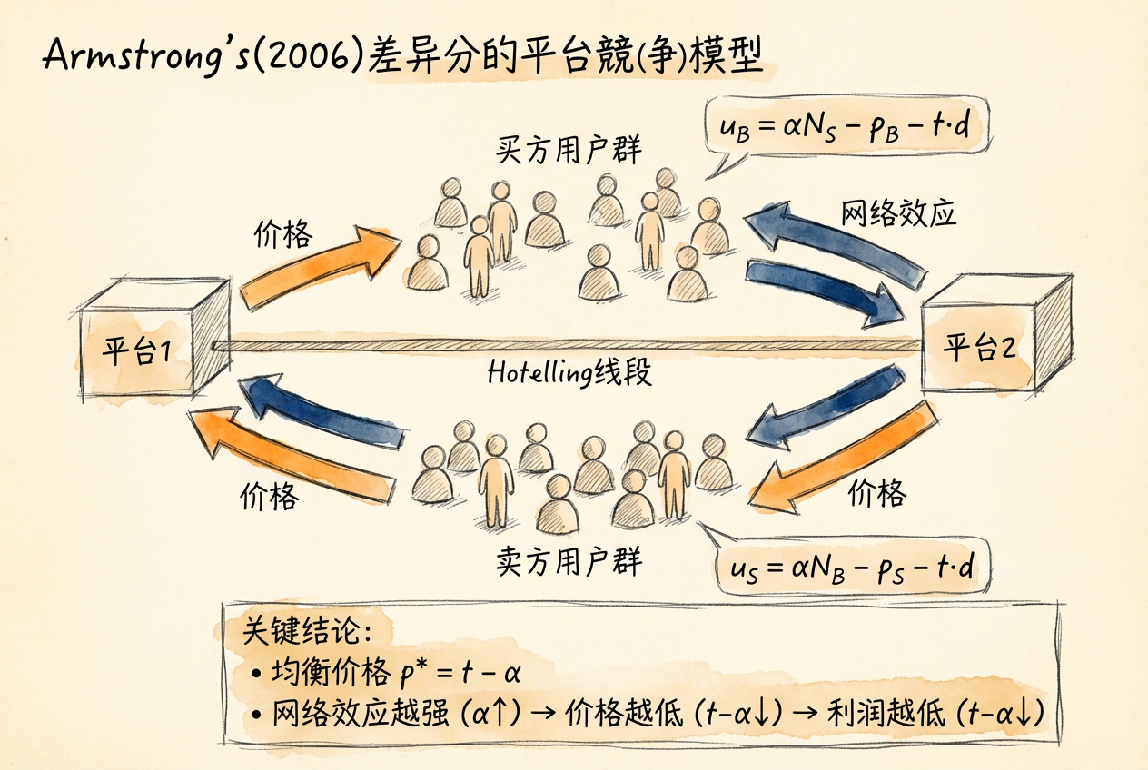 当多个平台在市场中共存时,它们如何竞争?Armstrong (2006) 的经典模型提供了分析框架。