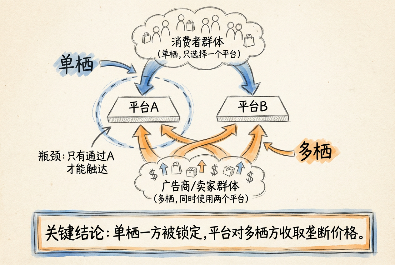 当买方单栖、卖方多栖时,每个平台对其买方用户群体形成「瓶颈」。卖方为了触达特定平台的买方,必须向该平台付费,即使卖方已经加入了其他平台。这使平台可以对卖方收取垄断价格。